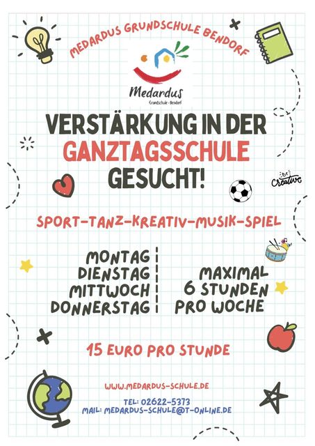 Für das Schuljahr 25/26 bieten wir eine freie Stelle für den Bundesfreiwilligendienst an. Wer Lust auf angeleitete und selbstständige Arbeit mit Kindern hat, ist bei uns gut aufgehoben. Neugierig? Schau dir den Flyer an und melde dich gern bei uns.